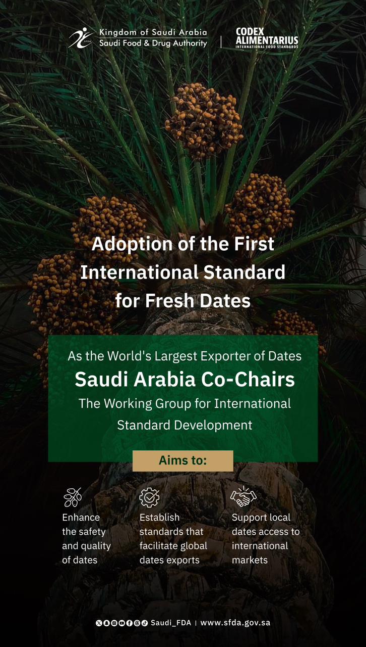 This global adoption reflects the Kingdom’s leading position in the dates sector, as the world’s largest exporter of dates, and highlights its influential role in shaping international standards that contribute to raising food quality and safety globally. Furthermore, it highlights the active role of the Saudi Food and Drug Authority (SFDA) in strengthening the international food standards system and enabling Saudi products to compete in global markets.