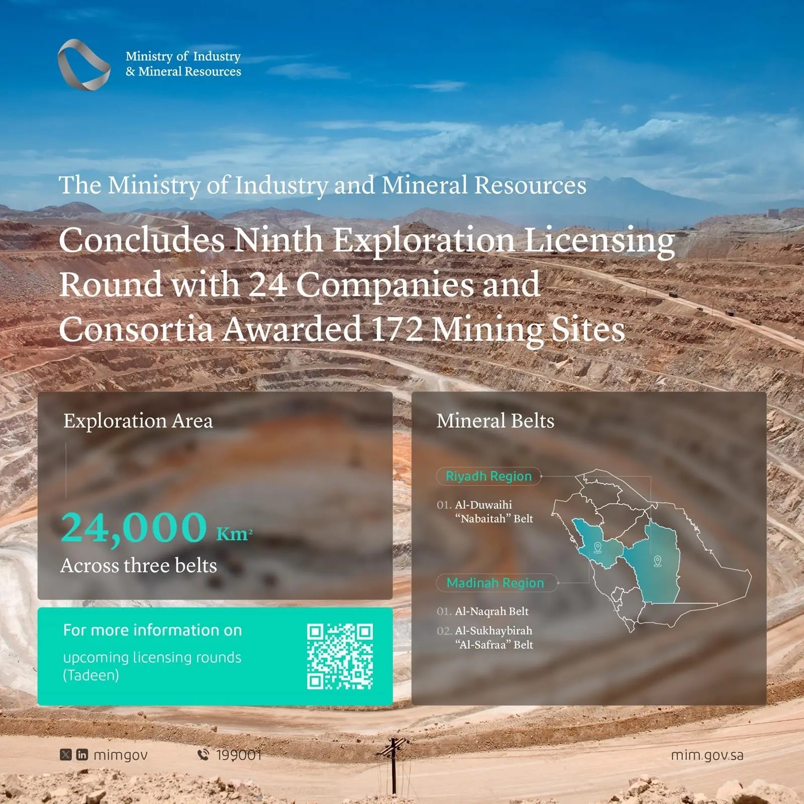The Ministry of Industry and Mineral Resources today announced the names of 24 companies and consortia that have won licenses in the ninth exploration licensing round, the largest in the Kingdom’s history to date. The winning entities were awarded 172 mining sites, including 76 sites that advanced to a multi-round public auction, across three mineralized belts in the regions of Riyadh, Madinah, and Qassim, with total committed exploration spend of over SAR671 million during the first two years of their work programs.